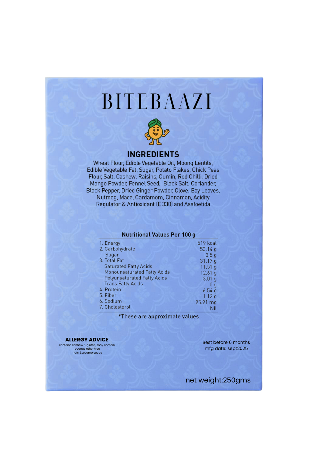 Discover the rich heritage of Gujarati cuisine with our Mini Dry Kachoris. These golden, round delicacies are filled with a flavorful mixture of lentils and spices, creating a satisfying crunch with every bite. Made using traditional methods, they offer the authentic taste of homemade kachoris in a convenient, long-lasting form.